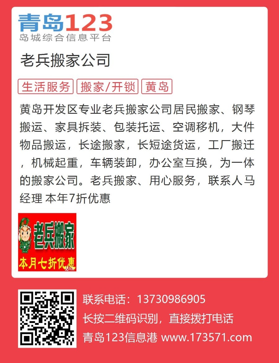 黃島開(kāi)發(fā)區(qū)專業(yè)老兵搬家公司 居民搬家、鋼琴搬運(yùn)、家具拆裝、包裝托運(yùn)、空調(diào)移機(jī),大件物品搬運(yùn),長(zhǎng)途搬家,長(zhǎng)短途貨運(yùn),工廠搬遷,機(jī)械起重,車輛裝卸,辦公室互換,為一體的搬家公司。老兵搬家、用心服務(wù),聯(lián)系人 馬經(jīng)理 電話13730986905 本年7折優(yōu)惠
